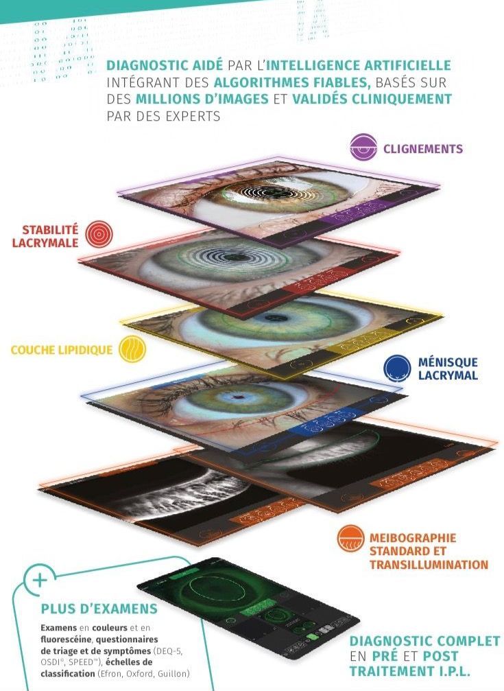 meibographie, l'étude du ménisque de larmes, l'analyse de la couche lipidique du film lacrymal, l'étude de la stabilité lacrymale et l'analyse du clignement.
