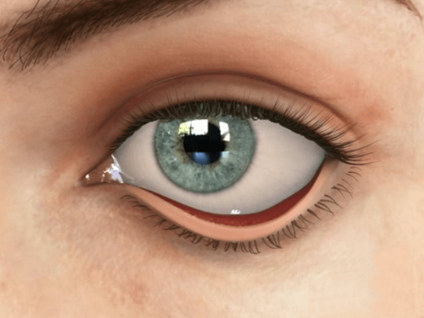 La conjonctive palpébrale alors exposée peut se kératiniser, la rendant très rouge.