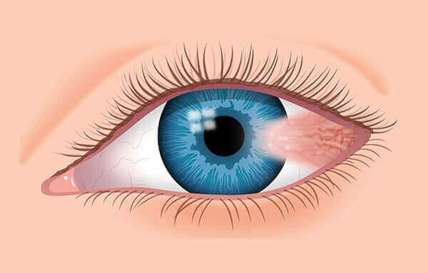 - Irritation de l’œil et rougeur du ptérygion lors des épisodes inflammatoires.